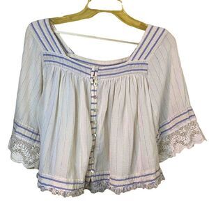 Top by Free People, Lightweight textured fabric, Metallic stripe design, Square neck, Crochet trim sleeves, Button front fastening, Regular fit - true to size, Machine wash, 100% Rayon