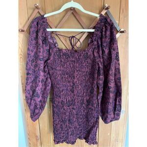 Free People mini dress with all over smocking and long puff sleeves that button at cuff and tie in back detail. Square neckline with ruffle trim on this hazelnut-purple color floral print. NWT