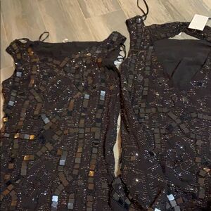 Reviews say to go up one or two sizes. It is a pullover style and it is hard to get on and off if it’s too tight. Fitting a little loose is actually flattering with this dress. Please check measurements. Stunning shift dress featuring shimmering sequin and beaded embellishments all over with a back cut out detail. There will be some loose beads. I will tighten all that I see. Lined. 20’s flapper dress!