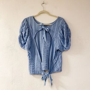 SO cute and in excellent preowned condition from Free People! An airy allover pointelle knit and a breezy open back create showstopping style. Crew neckline; adjustable tie closures at back neckline and waist. Eyelet-style pointelle detailing. Short puff sleeves.