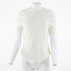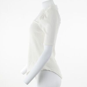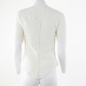 A puckery knit hugs your curves in this soft T-shirt featuring a deep V-neck with raw seams.
