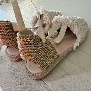Free People Vida Espadrille Wrap Cream Crochet Gold Beaded Heel 7, NIB