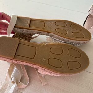 Woven crochet upper with rubber sole. Made in Spain. Ankle wrap tie closure. Metallic woven heel counter. Espadrille midsole