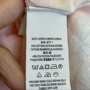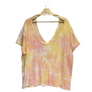 New with tags style number OB948619. Back drop cutout, oversized loose, v-neck, inside out shirt. Pink/yellow/orange pastel tie dye.