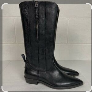Features: Tall style, lived-in leather fabrication, pointed toe, inner leg half-zip closure, pull tab, low heel
