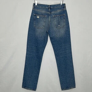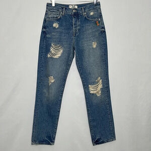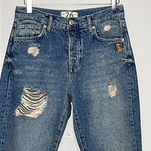 Free People/We The Free Bren Button Fly Boyfriend Jeans - Size 26. Great pre-owned condition. Previous owner added a bit of embroidery, shown in pic. No clue what it is (flowers maybe?) but would be super easy to remove if you so wish. Boyfriend relaxed fit, straight leg, factory distressing & fading, medium wash, button fly, 5 pockets, cotton & lyocell blend. Model pic is included to show fit. Please refer to actual product photos for color and distressing. Approximate measurements: 14" waist, 11" rise, 30" inseam. OB1311341
