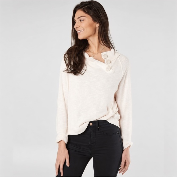 The Free People/We The Free Don’t Forget Me Cream Top in size small is a stylish and comfortable tunic designed for women. Made from a blend of polyester, rayon, and cotton, this pullover top features a solid cream color with a relaxed fit. It has a round neckline, long sleeves, and a casual sleeve type, making it perfect for a bohemian-themed outfit. The top also includes fringe and button accents, adding a touch of detail to the design. Easy to care for, this top is machine washable and offers a stretchy and oversized feel for a trendy look.