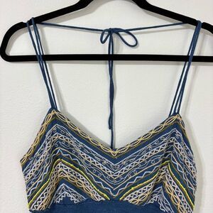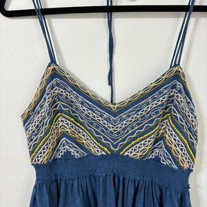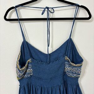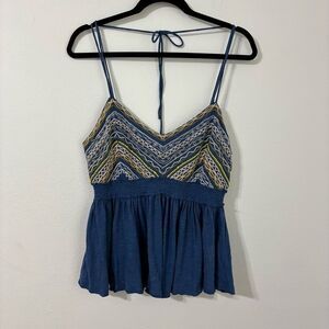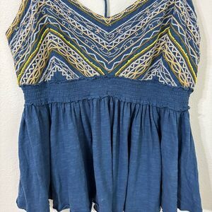 Free People XL Blue Babydoll Cami Top Cotton Linen Blend Embroidered Boho Hippie