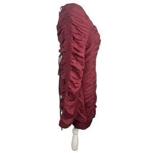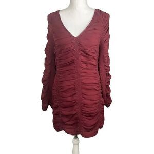 Embrace the Wild West with this stunning Free People mini dress. The dress features a solid pattern in a beautiful red color, perfect for any party or cocktail occasion. The dress is made of high-quality polyester material and has a V-neckline with long bell sleeves that add a touch of elegance to the overall look.