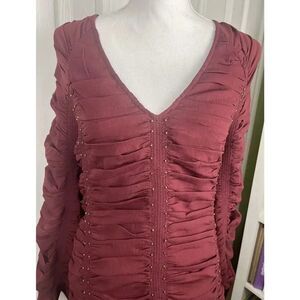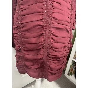 The dress also has a side zip closure, pleated accents, and studded details that make it stand out. It is a size 6 and has a short dress length, perfect for those who love the western theme. The garment care instructions are to hand wash only. Get ready to turn heads with this beautiful dress from Free People, perfect for any fashion-forward woman.