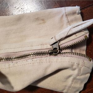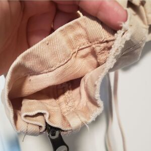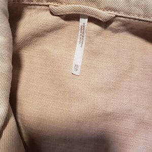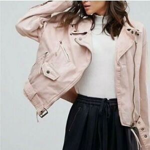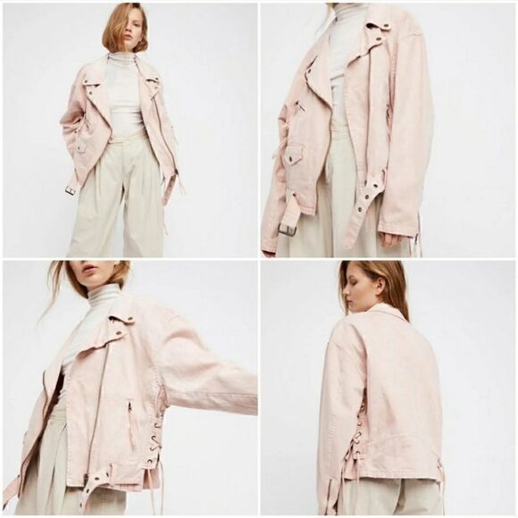 Free people motto jean jacket, color light pink size XS. Zipper closure, zippers on cuffs. Side laces. Zippered pockets, belted. Heavy, with distressed details throughout. Needs some cleaning. 100% cotton. Measures approximately 22" chest measuring from underarm to underarm, 22" sleeve measuring from shoulder seam, and 22" long measuring from back collar to hem. So cool!