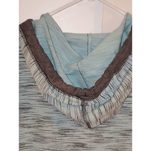 Nice Free Planet men's hooded sweater shirt. This is 90% cotton and 10% polyester and a lighter weight sweatshirt type of material. It is a light blue with veriegated lines running through it and gray trim at the neckline and around the hood. This piece is in very nice pre-owned condition. It has a very beachy surfer boy vibe to it. It is 22" from armpit to armpit and 29" from shoulder to hem.