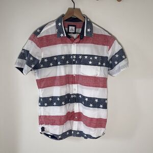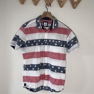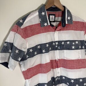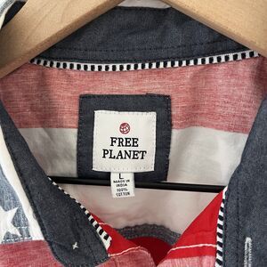 Free Planet Mens Red White Blue Button Collar Shirt American Flag Cotton Medium