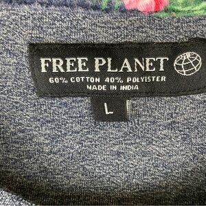 Free planet cotton blend t-shirt. Heathered navy, white and hibiscus floral print diagonally across the front. All navy in back. Loose fit. Women’s size large. Excellent preowned condition. Clean, smoke free home. Super fast shipping!