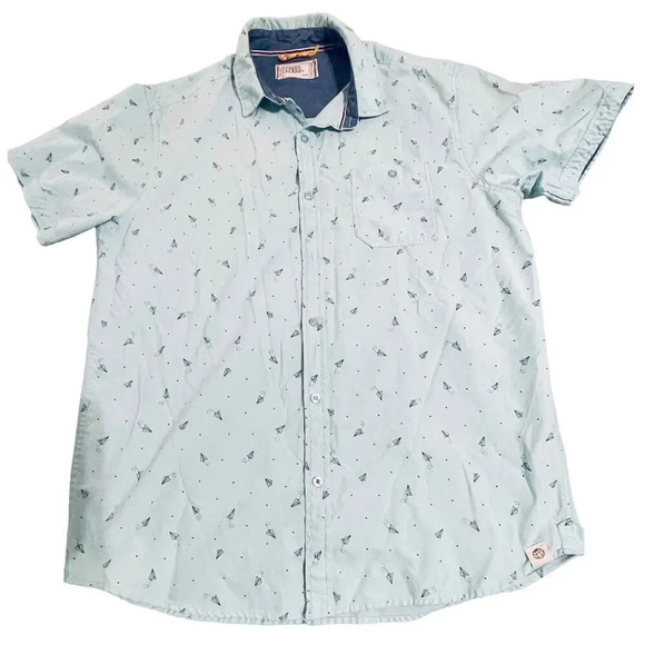 Free Planet SZ Large Short Sleeve Button Down Shirt Light Blue Paper Airplane