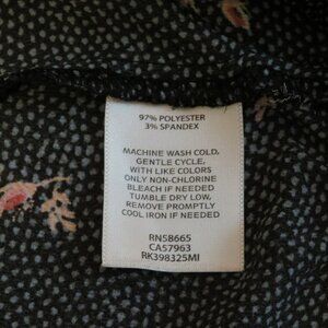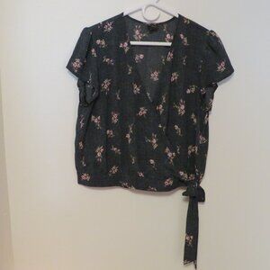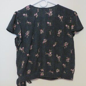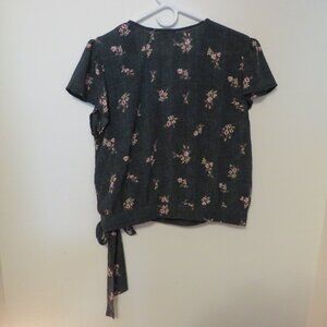 Free Press Blouse Short Sleeve Black w Pink Flowers & Green Dots Size L Women's