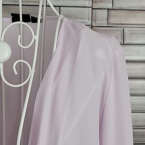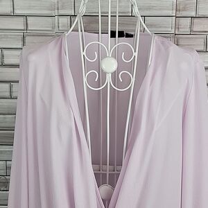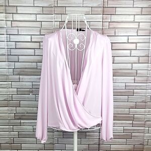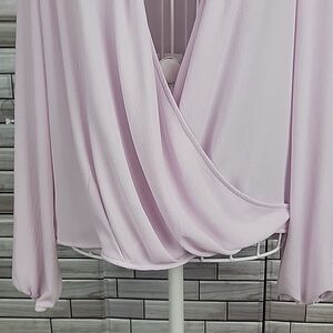 Polyester spandex blend lightweight summer blouse by free Press in a soft lilac purple color with a faux wrap front, long sleeves with elastic cuffs, and a straight hemline. Great pre-owned condition.