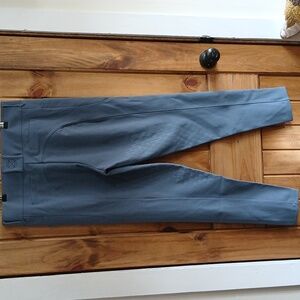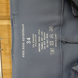 Free Ride Equestrian riding breeches. Size 34. Ocean blue with silvertone hardware. Inner leg grippers. Measures (flat): 16" across waist, 28 1%2" inseam, 39" overall length.