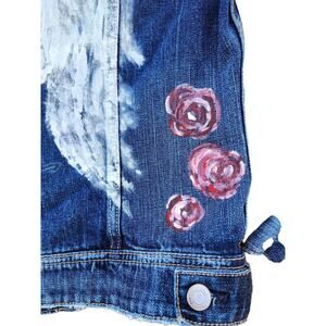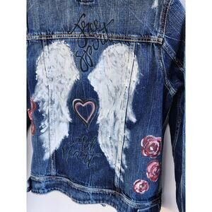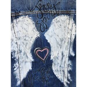 Free Spirit Angel Wings Wild Heart Roses Hand Painted Distressed Denim Jacket S