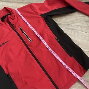 Free Tech red and black lined jacket size medium. Please see photos for measurements and tags. The Free Tech sticker on the back of neck is peeling. Otherwise, excellent Used Condition.