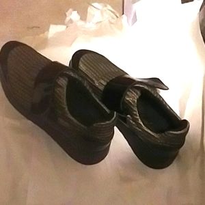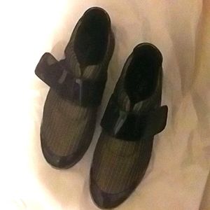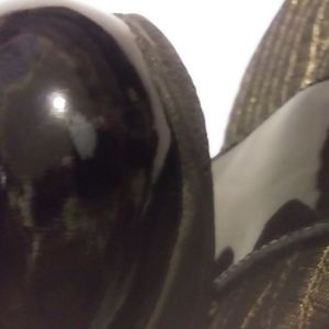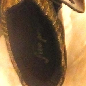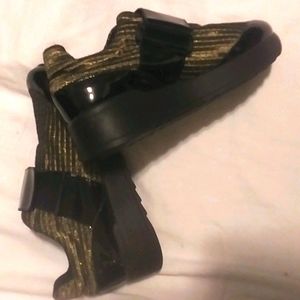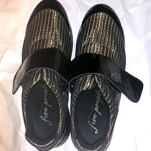 RARE! Chillax in these metallic gold 2" platform slip on sneakers by Free the People. Accented with black patent leather toe and adjustable hook and loop strap. One small scuff at the tip of one shoe. (See pic). 40 is stamped in the bottom of the shoe. Worn to try on only!