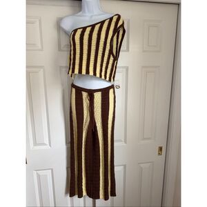 Bold meets breezy with this fauxchet set from free-est, featuring a one-shoulder top and low-and-loose pants for the perfect laidback duo.