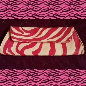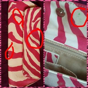 Pink and White Zebra clutch. This was bought new and got scratched in my closet. Please review pics to scratch details. White is not a true shit but a creamy white. Bundle discount of 20 and get these for free when you add 3 other items to your bundle!