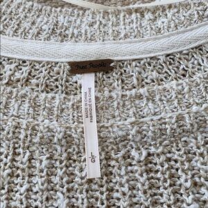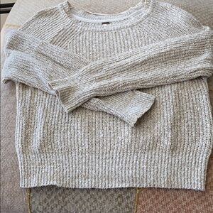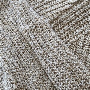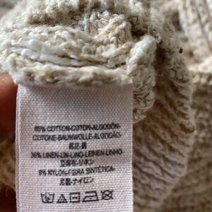Knit sweater color is oatmeal size L fits like a medium has no pulls fabric is 55% cotton and 36% linen9% nylon