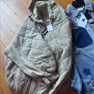 Soft quilted puffer with attached hood. Front zip closure for easy wear. Neutral sage green for versatile layering. Lightweight warmth for everyday use.