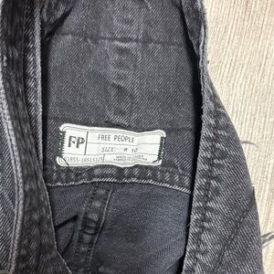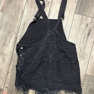 Stylish black denim overall dress with frayed hem. Perfect for casual outings.