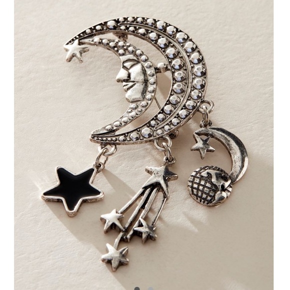 Elegant silver brooch featuring a crescent moon and stars. Black accents add contrast. Perfect for adding a celestial touch to any outfit.
