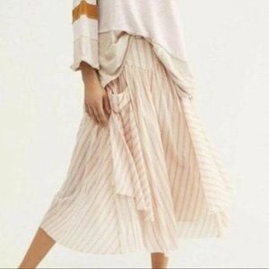 An effortless essential, this gorgeous midi skirt is featured in a striped cotton fabrication with exaggerated waistline and pocket detail