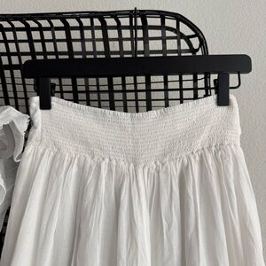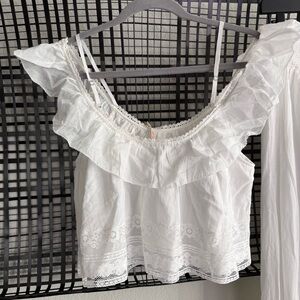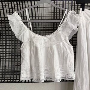 So effortless and ethereal, this timeless set features a relaxed, lace-adorned top with cold shoulder detailing and a coordinating, billowy pant with sheer lace trim at bottom for a sweet and special finish.