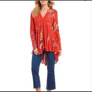 Woman’s tunic in color tomato combo. V-neck, long sleeve tunic with collar and button wrist.
