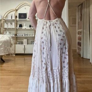 Elegant floral lace halter maxi dress in cream with flowers. Perfect for any occasion with its delicate design and comfortable fit. Worn once