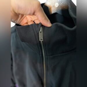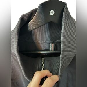 Lightweight, breathable fabrication, zippered front, high neckline, pockets at sleeves, flattering seams throughout