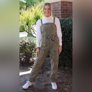 Sturdy denim shapes a straight neckline, with removable, adjustable tank straps, and a seamed bodice. Fitted waist, with tying sash, sits above relaxed pant legs with two diagonal front pockets, cargo pockets, and twin flap pockets at back. Cute cutout open back has button closures. Hidden side zipper/clasp.