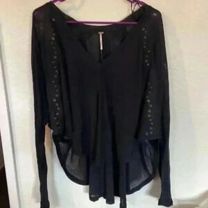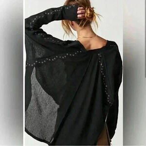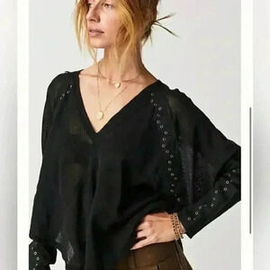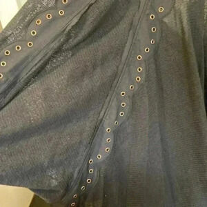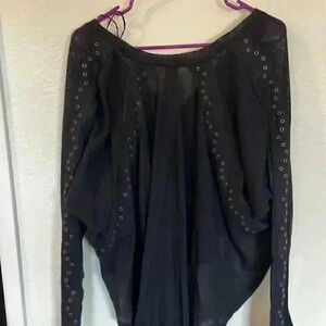 effortless edge to any look with this so cool top featured in a drapey, oversized fit with exaggerated sleeves, rivet detailing, and semi-sheer fabrication for a daring, dimensional look.