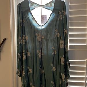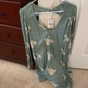 Free people with tags mini dress or tunic. Unworn tags still on with embroidered flowers in moss green rayon