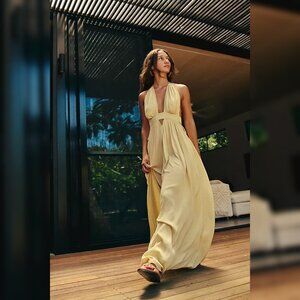 Sun goddess maxi in a crinkly crepe with a deep V-neck.