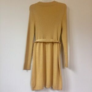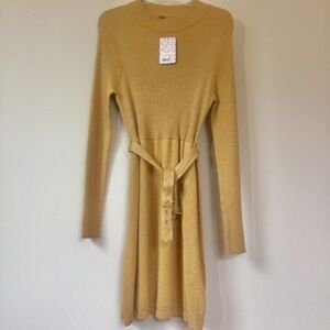 Free people Metallic Gold Yellow long sleeve Belted Sweater Dress M