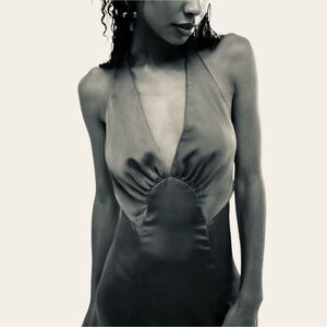 Features: Soft satin fabrication, plunging V-neckline, flattering seaming throughout, exaggerated leg slit, halter-style with an open back, ruched back detail, lined