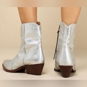 These Free People ankle booties feature a striking metallic silver finish, embodying a modern twist on classic Western style. With a pointed toe and low stacked heel, they offer both comfort and a fashion-forward edge. The smooth, glossy leather and subtle brown leather accents make these booties a standout choice for any occasion. Genuine leather upper, lining, and sole. Balance man made materials.