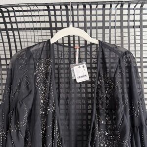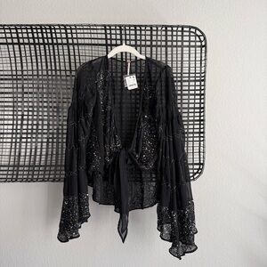 Add the loveliest touch to your layering collection with this drapey, lightweight jacket featured in a sheer fabrication and wrap-inspired silhouette with exaggerated sleeves and sequin detailing throughout for a special, sparkly finish.