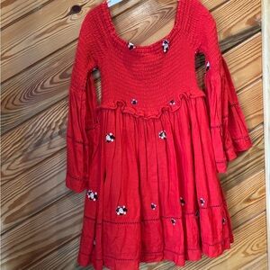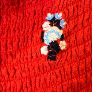 Free people off the shoulder red dress with embroidered flower design. Women’s size small. Excellent condition, no flaws. Smocked all the way around up top, double lined, flared sleeve.