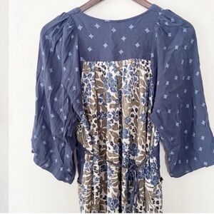 Excellent condition. Blue combo printed. Floral print. Flared elbow length short sleeves. Deep v-neck. Adjustable tie back waist. Mini length.