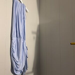 Chic light blue halter dress with a stylish draped design. Perfect for any occasion.