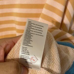 Cozy striped sweatshirt with a relaxed fit. Features peach and blue hues. Ideal for casual wear.