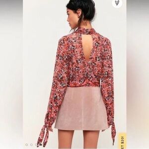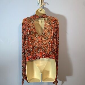 Free people all dolled up high neck sheer blouson tie sleeve cropped floral blouse orange brown grey white cream perfect for #fall size large lined front EUC