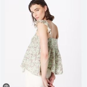 This light and lovely tank is crafted in a flowery print with ruffled straps and a smocked bodice.